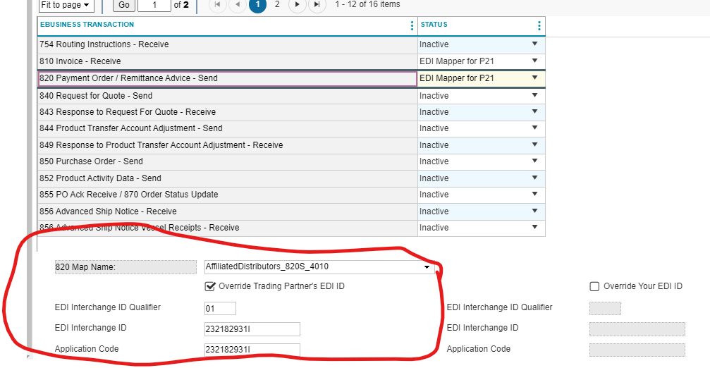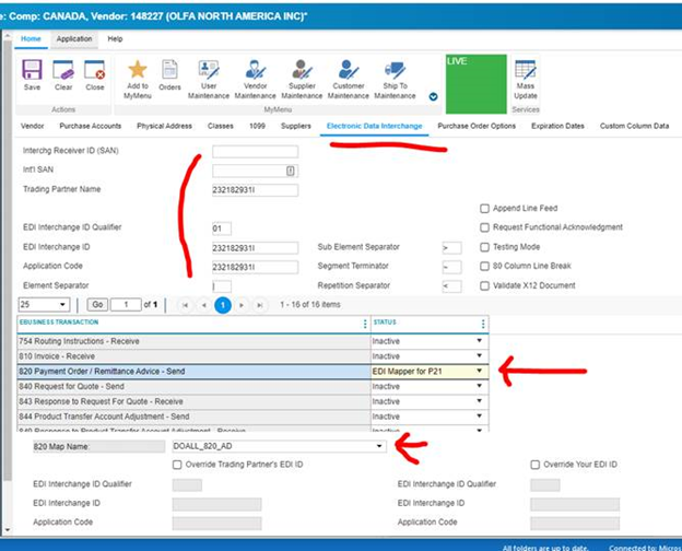 IMPORTANT NOTE: if the Vendor is sending or receiving other EDI data (these fields are already populated) do not overwrite! The below info will have to be put below the 820 Map Name Field.