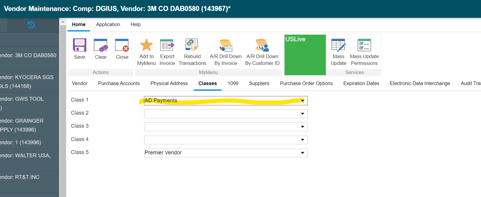 The changes needed are shown below on the typical AD vendor. The AD account number has to be put in the UDF field on the “Vendor” tab and the EDI has to be set as below. Be careful though as that last character for Trading Partner Name, EDI Interchange ID, and Application Code is a capitol i (I), not a | (pipe symbol) or a number 1. The Element Separator is | (pipe symbol). Press Shift + the key above enter to type it.