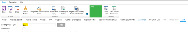 If ACH info is provided add it to the ACH tab in Vendor Maintenance, otherwise put ‘N/A’ to the Routing/SWIFT BIC field.