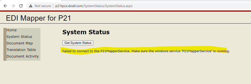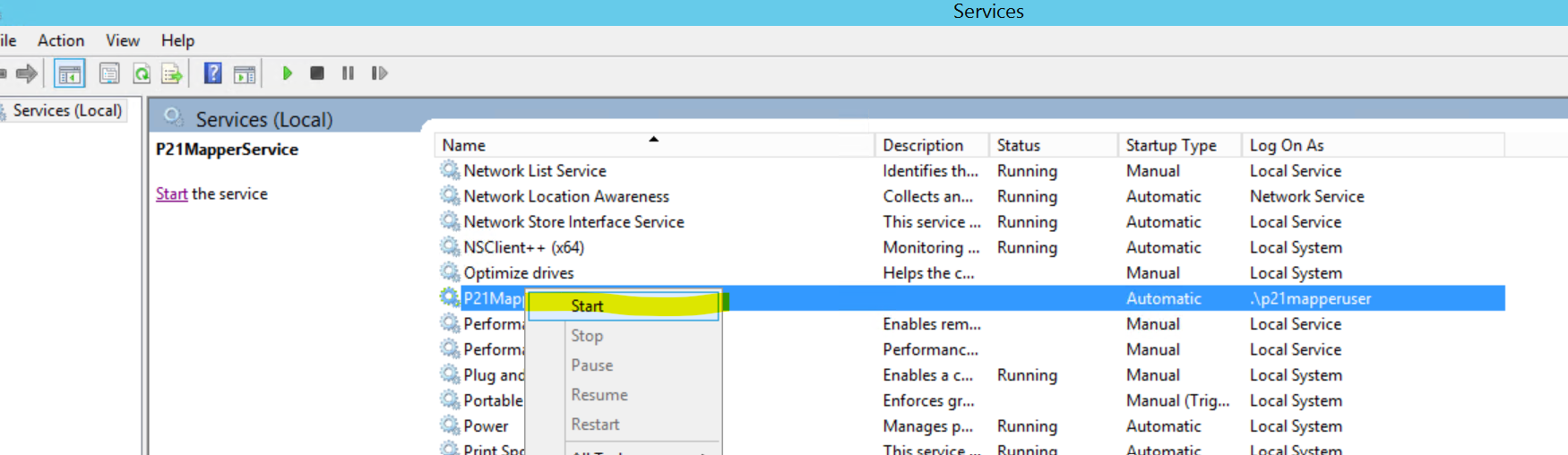 If a user reports the P21 Mapper is down, check the Mapper status then restart the service.