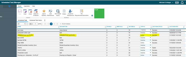 14. The schedule job will appear in the “Schedule Task Manager” as an “Active” job. After the job runs, the “Last Run Status” will show “Success” or “Failed”. If it runs successfully, you can go to the Purchase Order Entry screen, and search for all the PO’s that were created at the time of the execution.