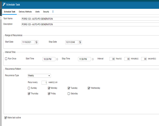 Description / Scope: This process will schedule a PORG to run unattended and generate Purchase Orders without having to do it manually.