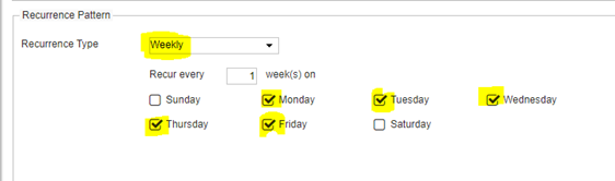 12. Select the desired “Recurrence Pattern”. Typically, setup as a Weekly schedule, with check boxes to select on the days to run.