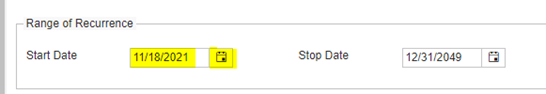 10. Fill in the Start and Stop date. Typically, the start date will be today, the end date is already filled in. Note you can double click on the calendar icon, to bring up a calendar to select from.