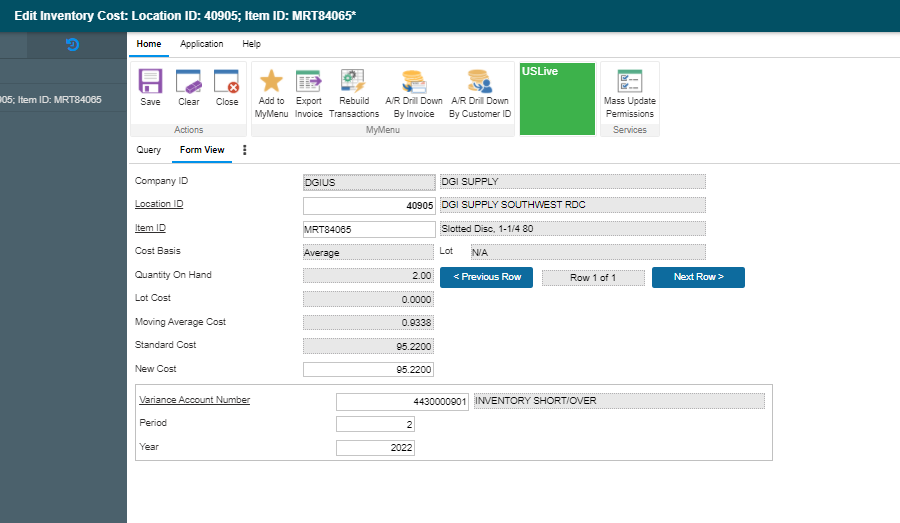 To use Edit Inventory Cost you will need to know the item id, location id, correct cost and the variance GL. The one shown below is the correct GL for the US.