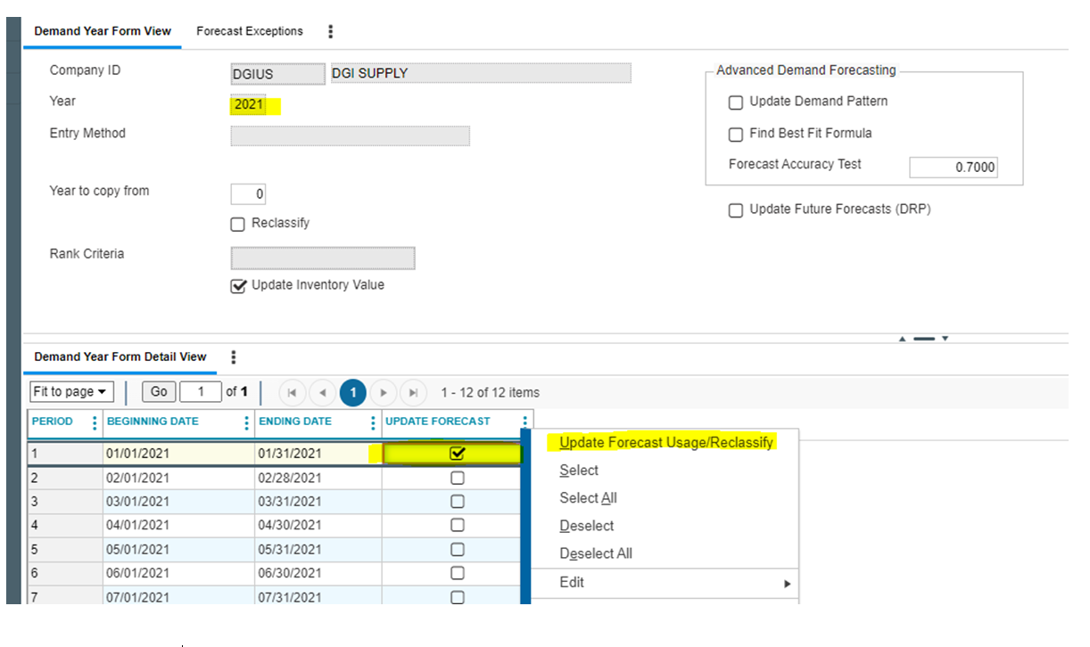 Run one month at a time. Usually going back one year, depending on the change. Select the first month to run, right click > update Forecast. Select the second month, , right click > update Forecast. Repeat 12 times and Save