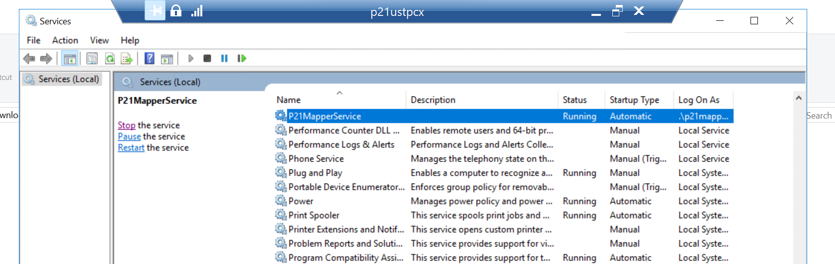 2. If there is nothing wrong with the schedule RDC into P21USTPCX for the US and P21USTPCX for CA. Open 'Services', find P21MapperService. If it is stopped, restart it. If it is Running, stop then restart the service.
