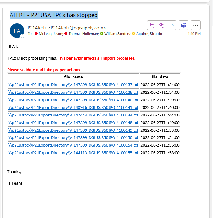 If files are not processing through SISM the EDI alerts team will get an email notification like the below. This alert fires if there are files in \\p21ustpcx\P21ExportDirectory, or \\p21tpcx\P21ExportDirectory for Canada, that are more than one hour old. So once you fix the issue it is possible the alert will fire until all files are processed. Go to the last step to confirm the problem is resolved.