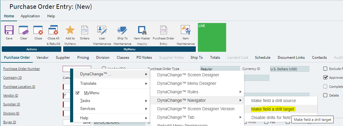 2. RMB click the field within the window that should be populated with the data from the source, Dynachange > Dynachange navigator > and select 'Make field a drill target'