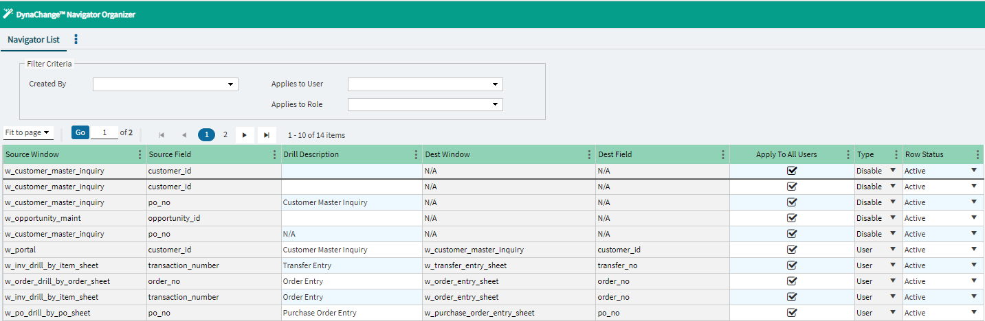3. Use the Dynachange Organizer Navigator to manage the drill downs.