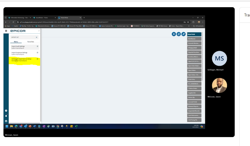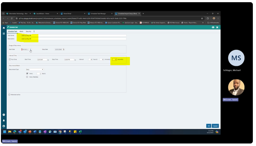 The following is the process of creating the SISM scheduled job task in P21. The key to making this work properly is to properly setup two steps. The first is the Schedule Import Service setup. All tasks which are turned on will get started by the SISM task. This SISM task is the second step. Once this task is defined and made active, all active jobs will get executed according to the time interval define in the SISM setup. The key is to have both steps setup AND active to make it work. If one, or the other step is not active, the jobs will not run.