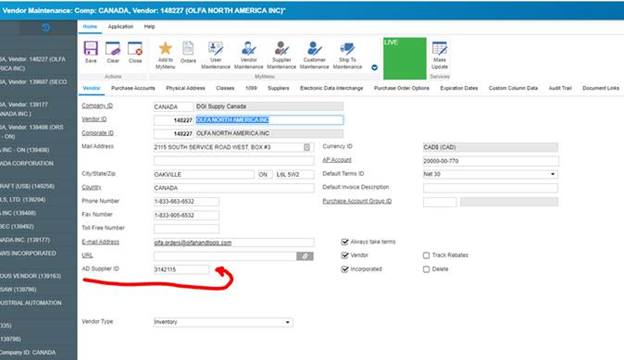 The changes needed are shown below on the typical AD vendor. The AD account number has to be put in the UDF field on the “Vendor” tab and the EDI has to be set as below. Be careful though as that last character for Trading Partner Name, EDI Interchange ID, and Application Code is a capitol i (I), not a | (pipe symbol) or a number 1. The Element Separator is | (pipe symbol). Press Shift + the key above enter to type it.