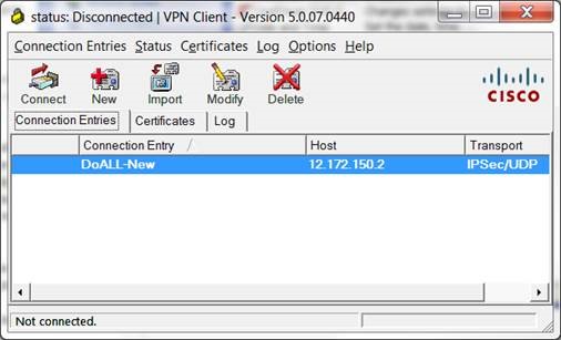 We have installed a NEW Cisco Firewall which will require users of the Cisco VPN to change the address they use to connect. The version of the Cisco VPN used may vary by user and system type. The address shown below 12.172.150.2 has been changed to 50.207.219.42