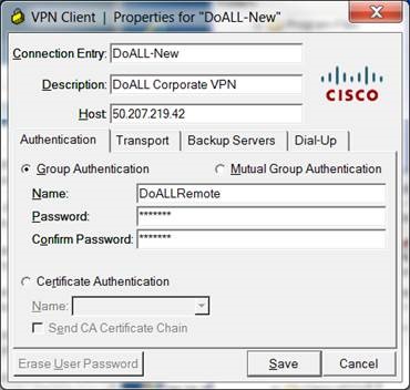 For those using any other version of the Cisco VPN Client, simply change the address you are trying to connect to 50.207.219.42 Please contact the helpdesk if you have any issues using helpdesk@doall.com email or email me directly. Thank you