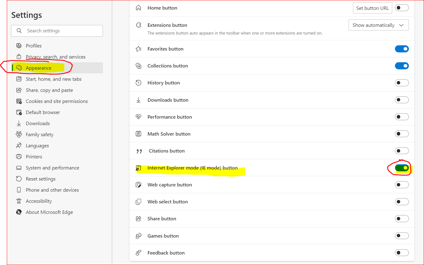 - Restart the browser and go to “Appearance” scroll down and make sure “Internet Explorer mode button” is enabled.