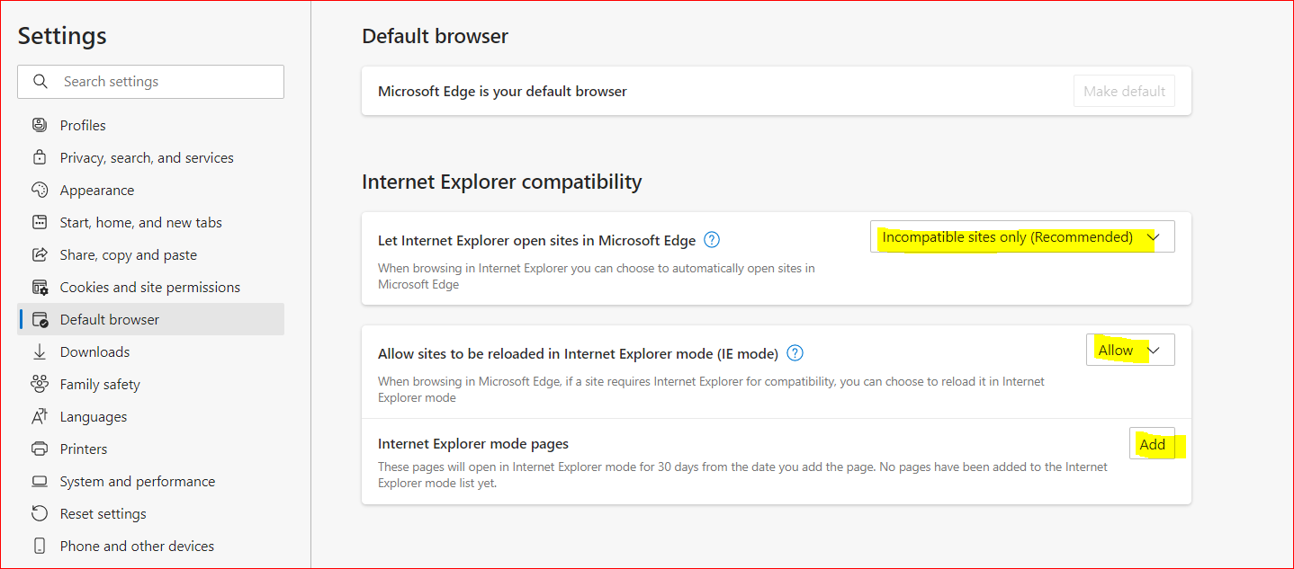 - Select “Incompatible sites only (Recommended)”, “Allow” from the dropdown options.