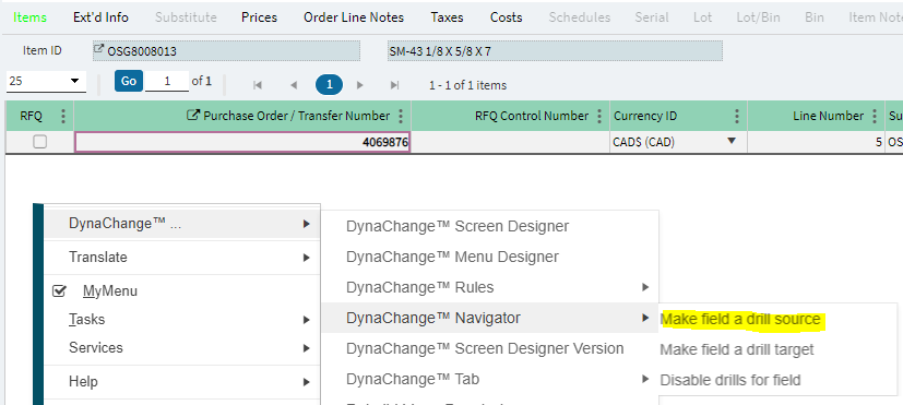2. RMB click the field within the window that should be populated with the data from the source, Dynachange > Dynachange navigator > and select 'Make field a drill target'